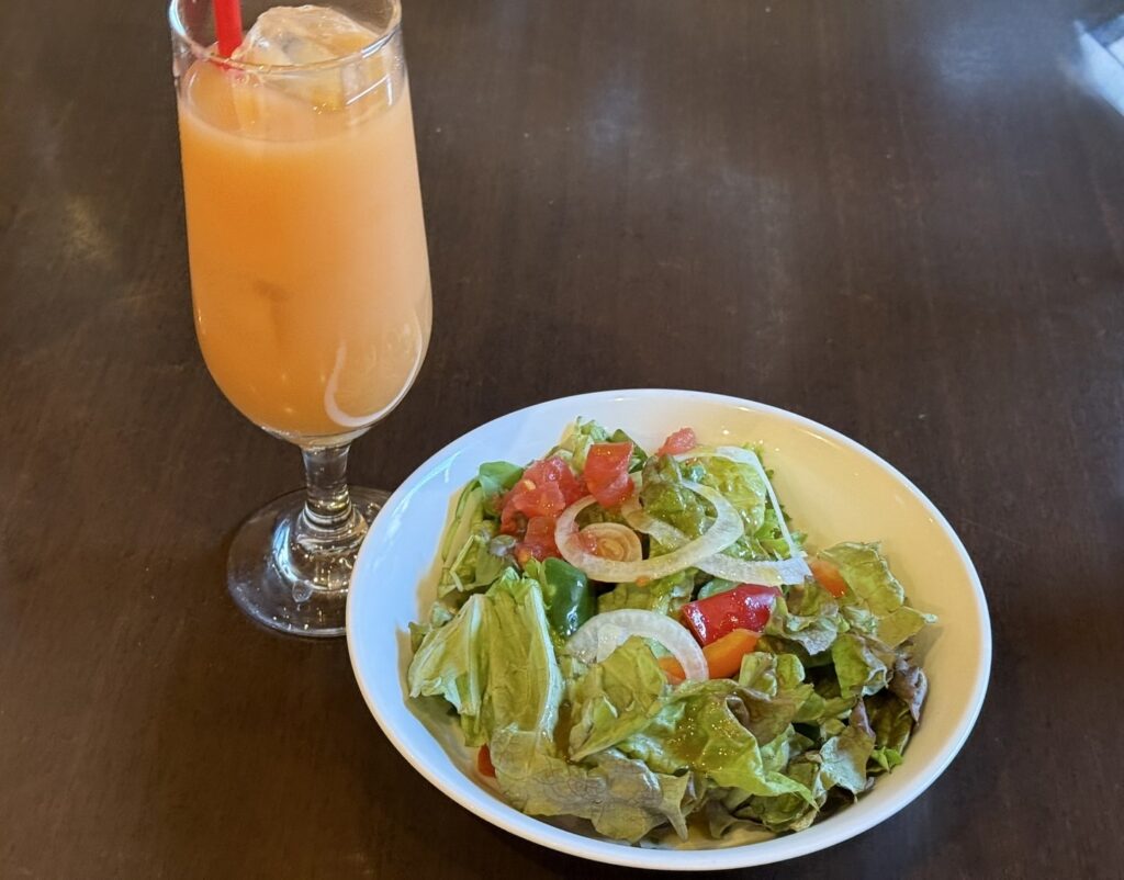 こちらがサラダと、ドリンクのグレープフルーツジュース。