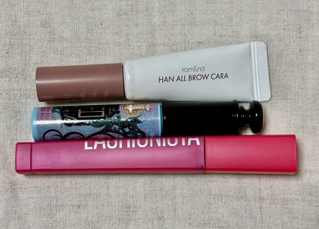 画像上はロムアンドのハンオールブロウカラ(眉マスカラ)