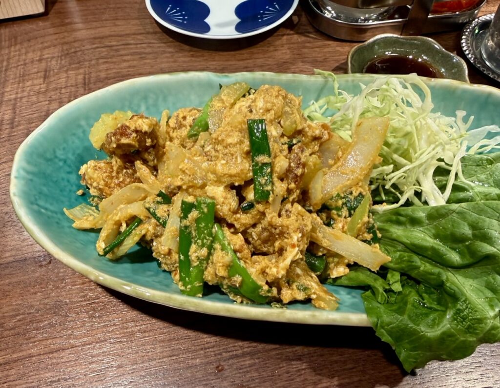 玉ねぎなどの野菜、卵のカレー炒め。