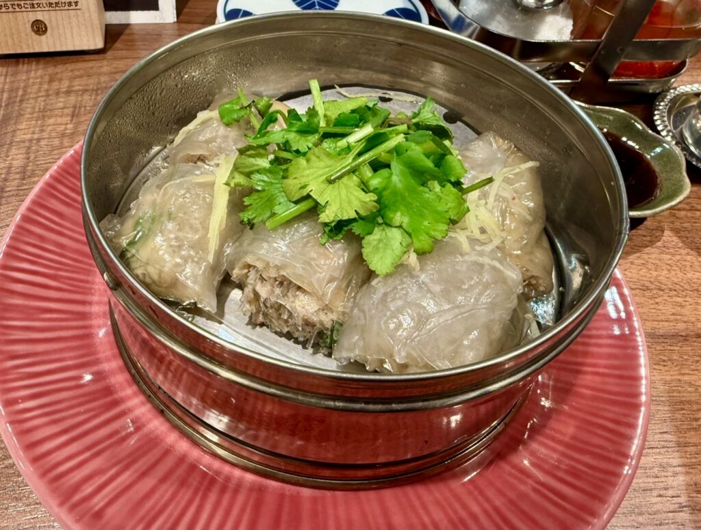 豚ひき肉、春雨、椎茸などの蒸し春巻き。